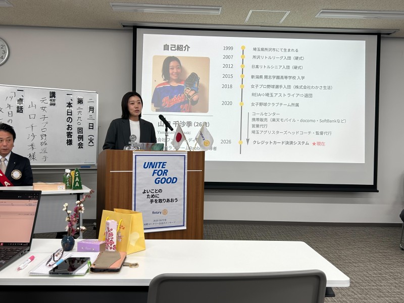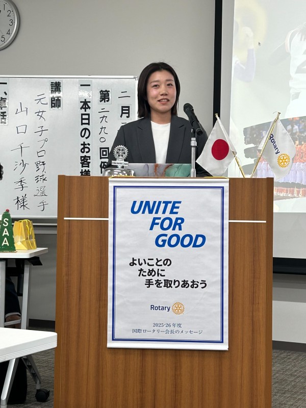 本日の卓話には、元女子プロ野球選手の山口千沙季様をお迎えしております。スポーツは国や文化を超えて人を結びつけ、平和の象徴ともいえる存在です。山口様のご経験とお考えを伺えることを大いに楽しみにしております。